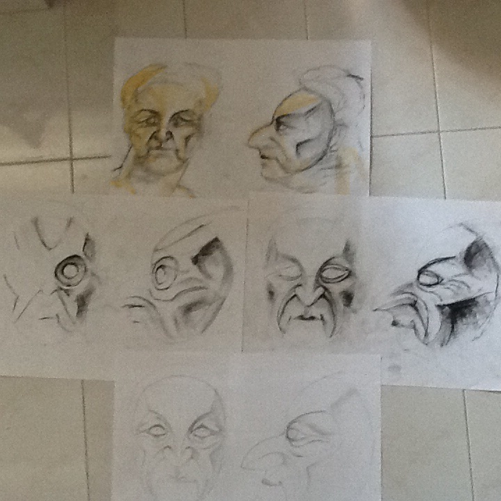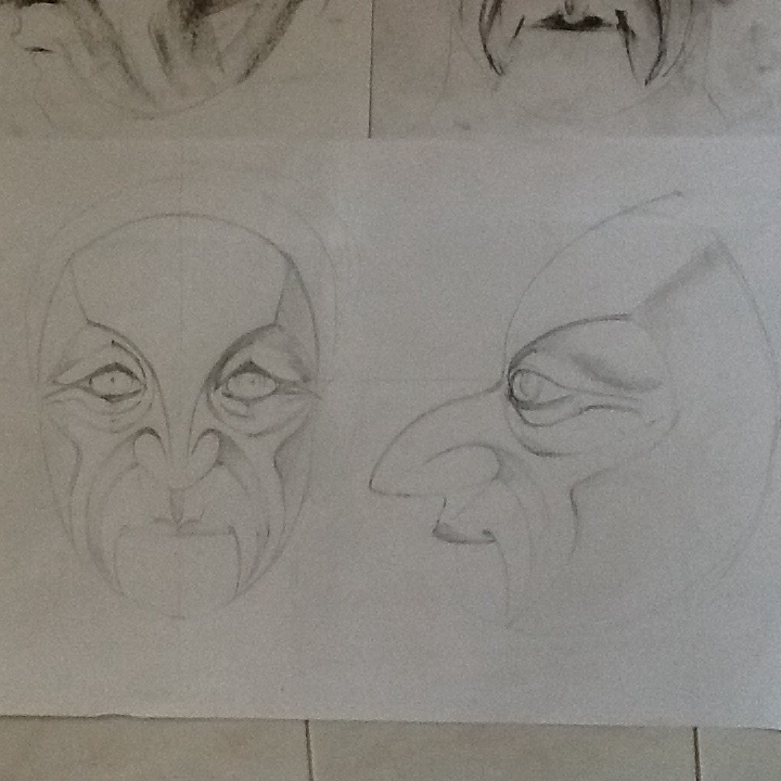 After two days intensive pedagogy, history, relationship building and emersion into the world of The Mask, we now collaborate to create contexts for our own masks and build up a repertoire of information a detailed characteristics from which we shall build up or own ‘mask’ but always in the context of our group scenarios. Starting to draw.